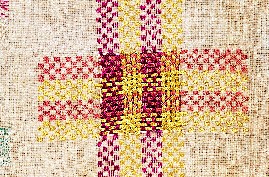 This detail from a darning sampler dated 1786 shows a darned cross with the ground fabric at the centre of the cross cut out and patched by interlacing the yellow and red darning threads across the hole.